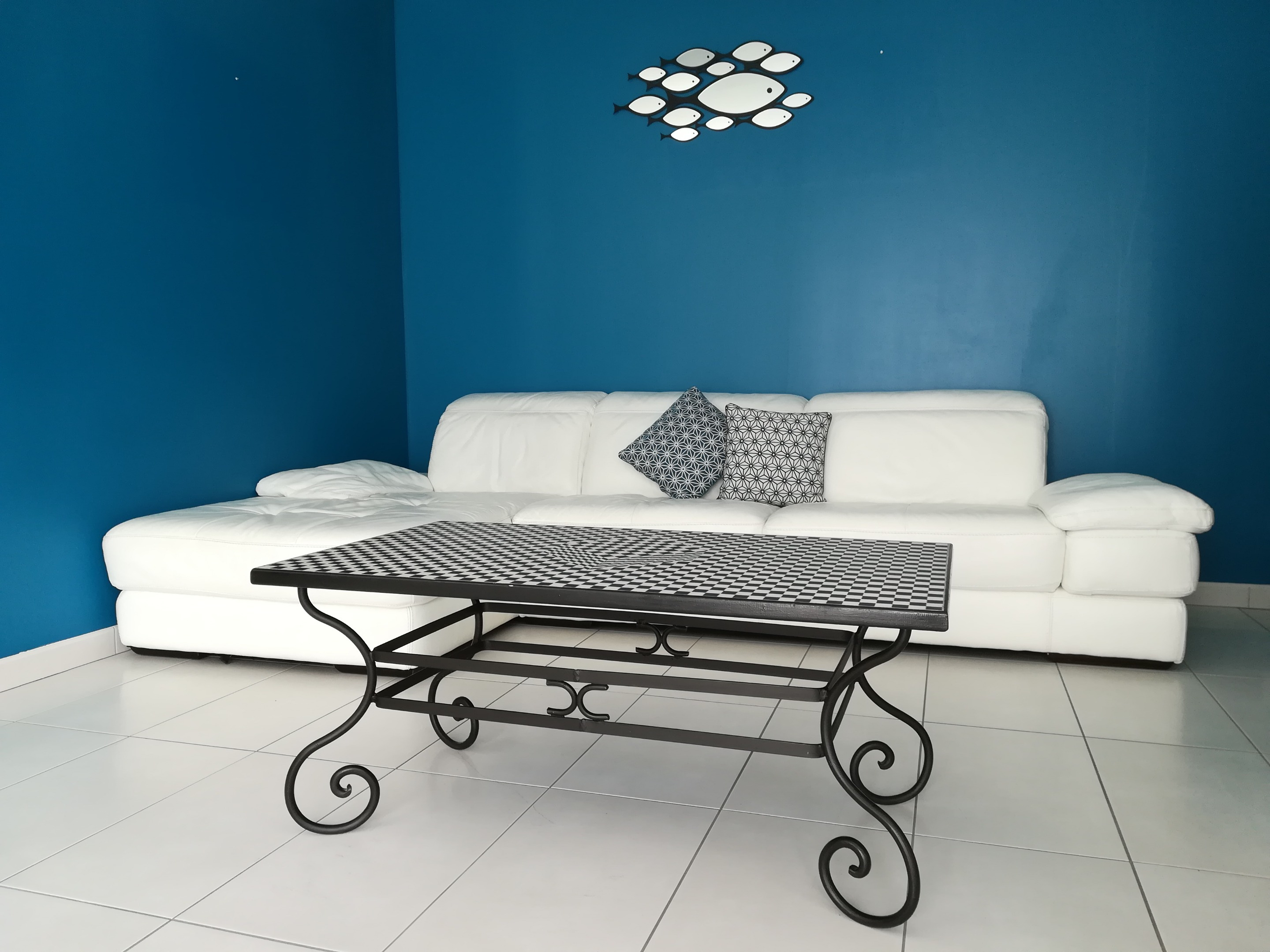 Le dessus de cette table en fer forgé, constitué auparavant d’une plaque de verre transparent, a été remplacé par un plateau recouvert d’une mosaïque.