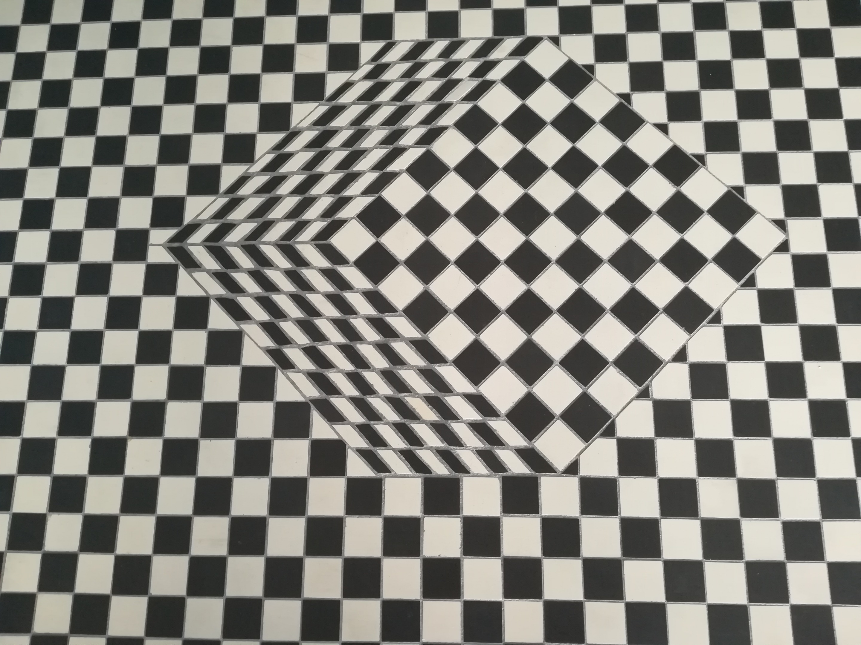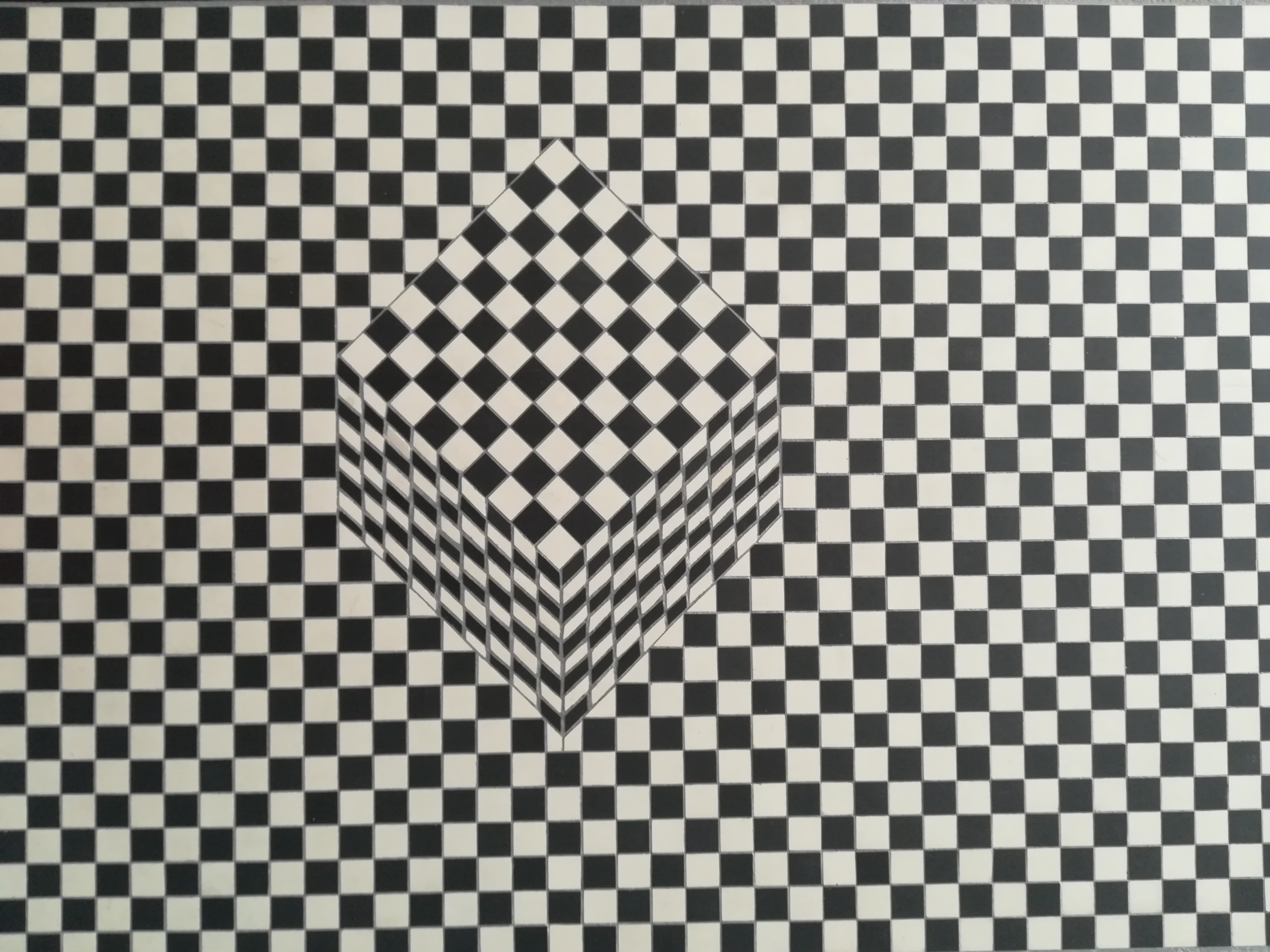 Le motif en damier à la fois sur le cube et le fond ainsi que la perspective du cube créent une confusion entre la 2 D et la 3D.