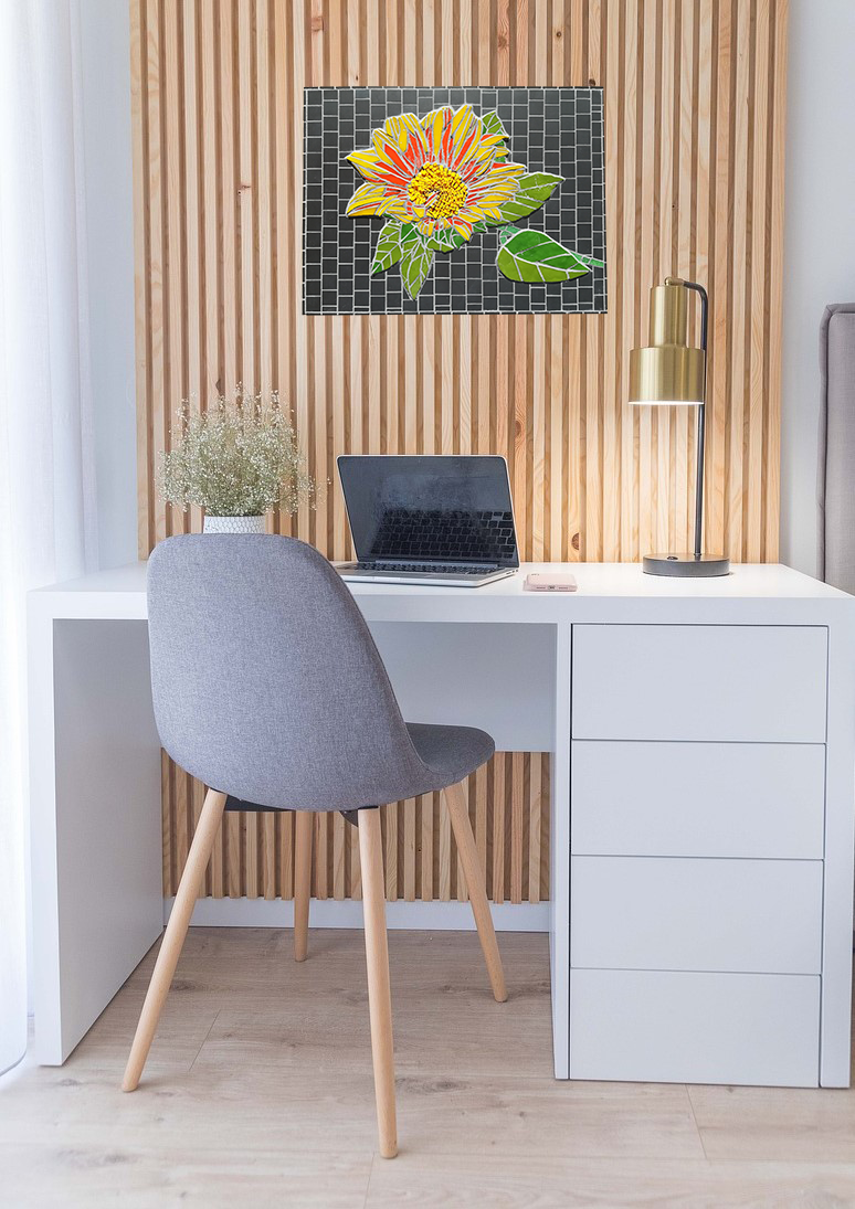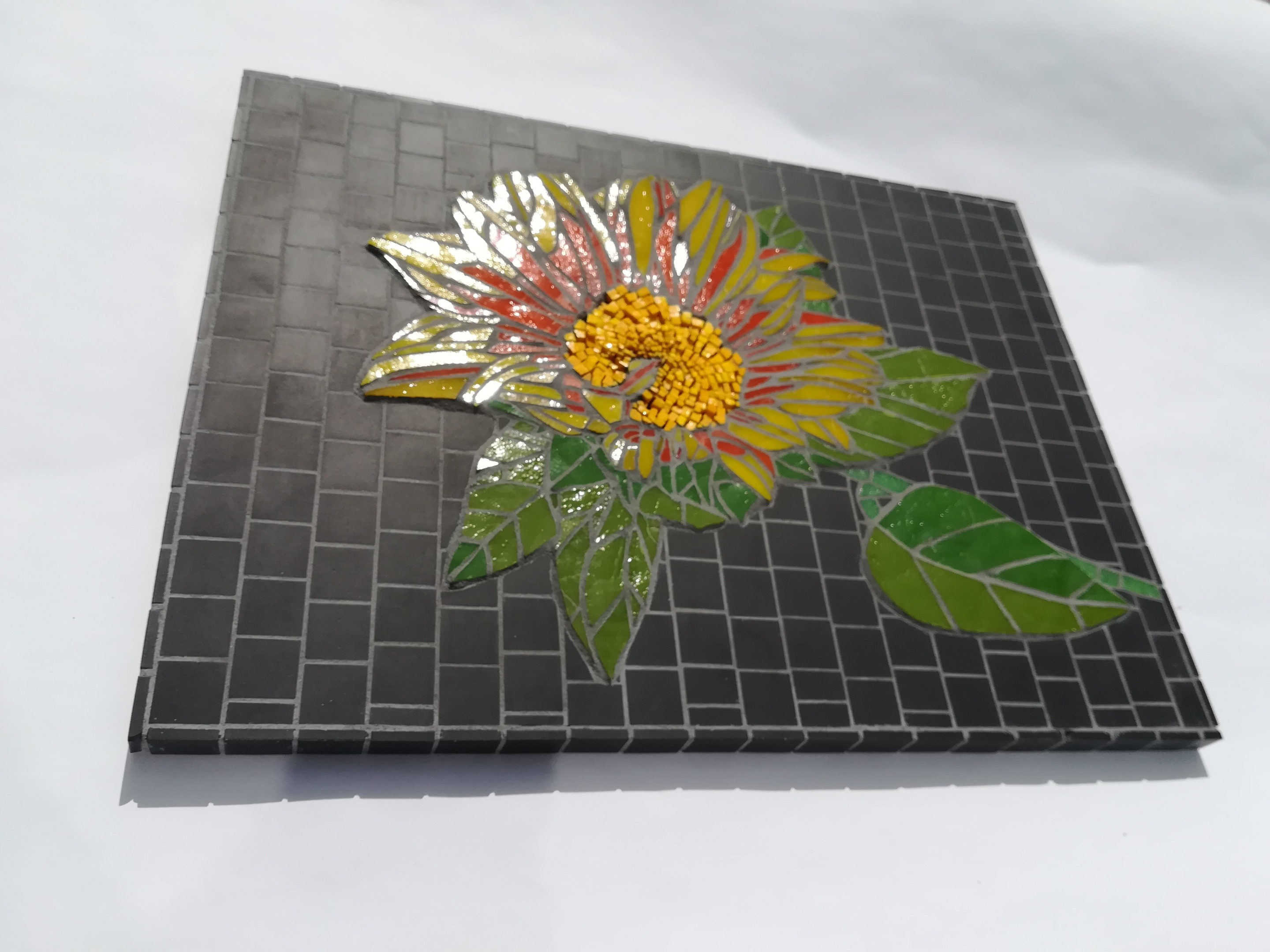 J’ai choisi pour cette mosaïque le verre fabriqué artisanalement dans les ateliers français Albertini ainsi que le smalt. Ces matériaux, par leur épaisseur et l’absence de joint contribuent à créer un relief et à donner l’impression que la fleur sort du tableau.