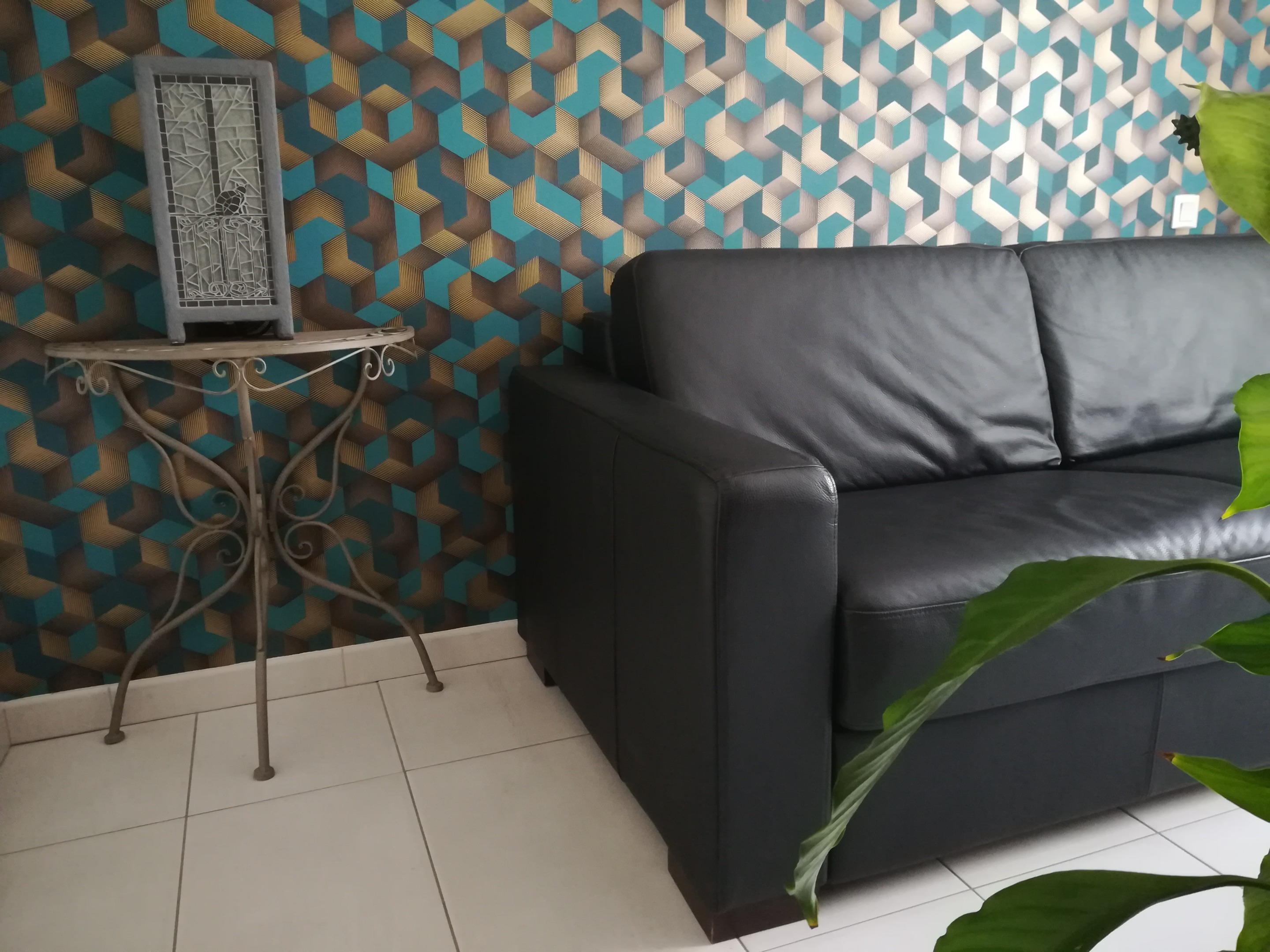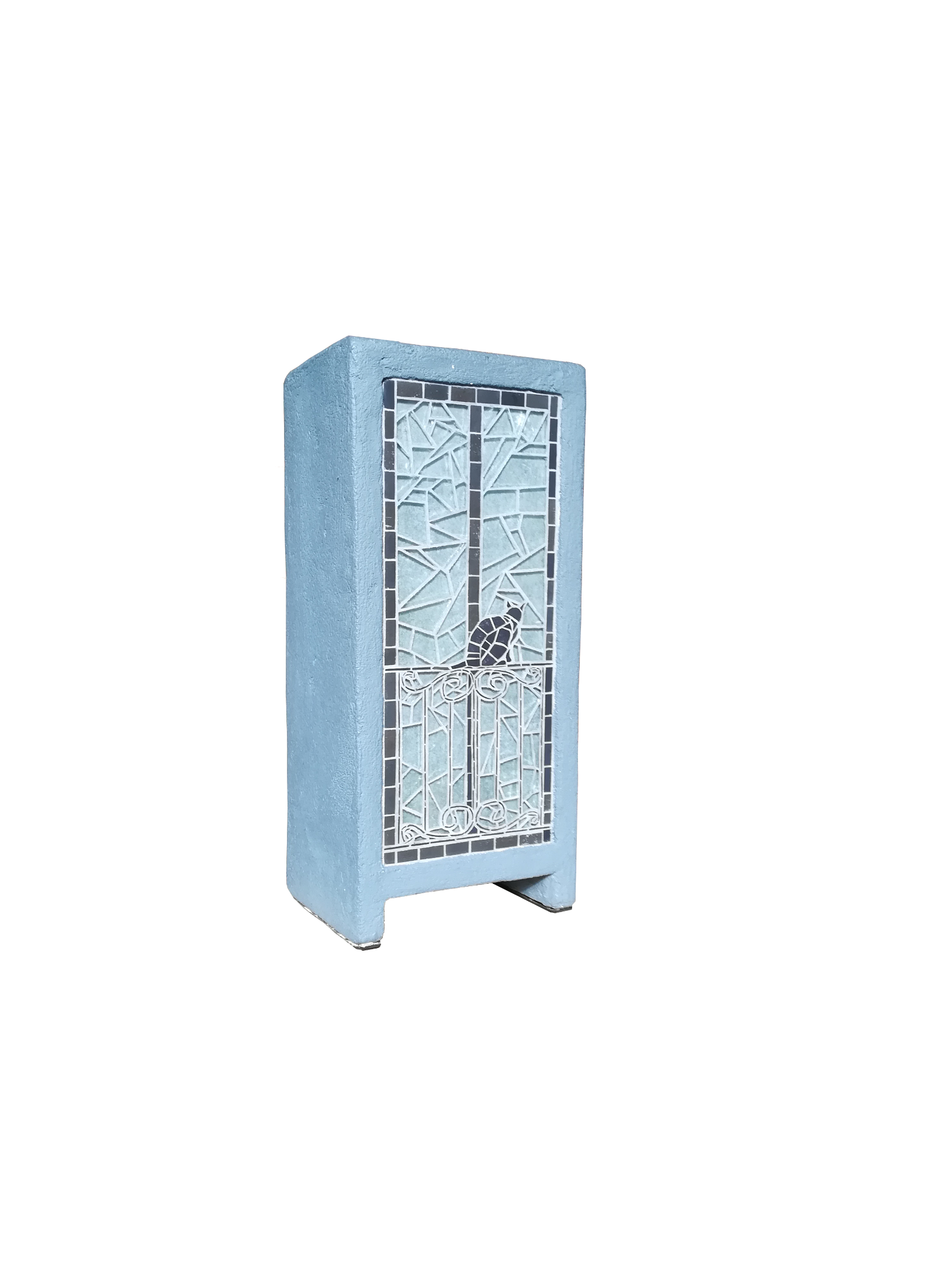 Une plaque de verre clair a été insérée sur l’avant. Cette plaque a été recouverte du côté intérieur d’un film tamisant et de l’autre d’une mosaïque de verre transparent et grès cérame noir.