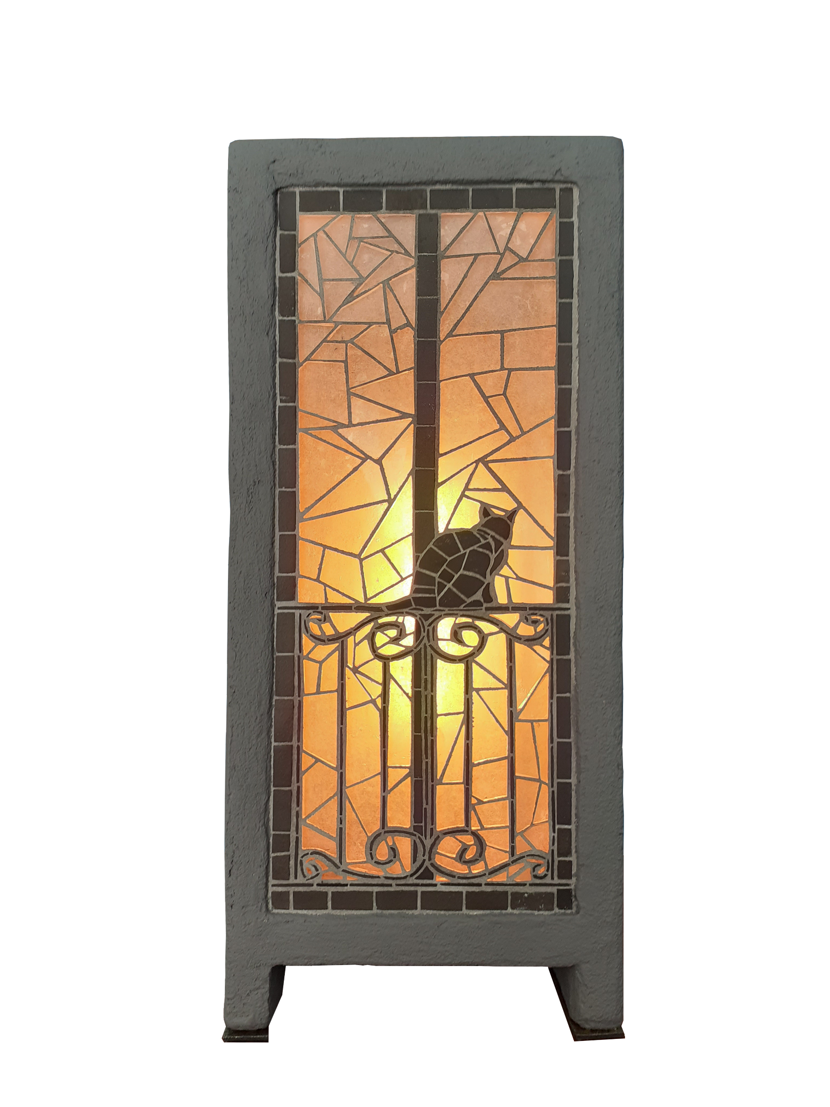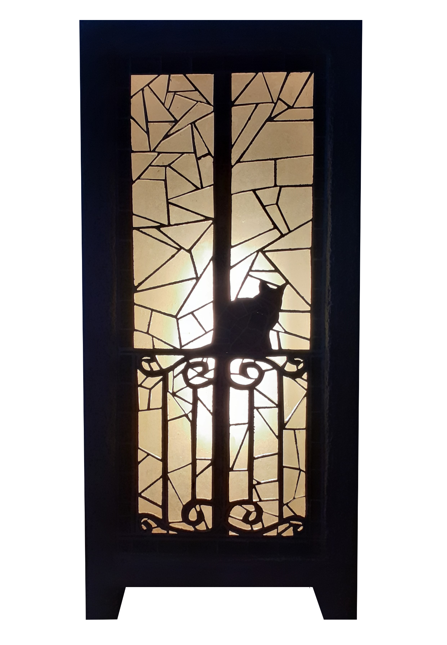 La « fenêtre » de la lampe appart chat dispose d’une balustrade sur laquelle le chat est grimpé et regarde à l’intérieur.