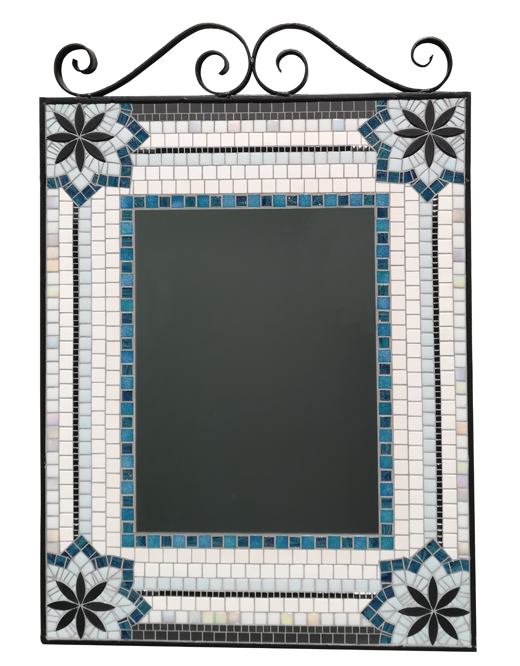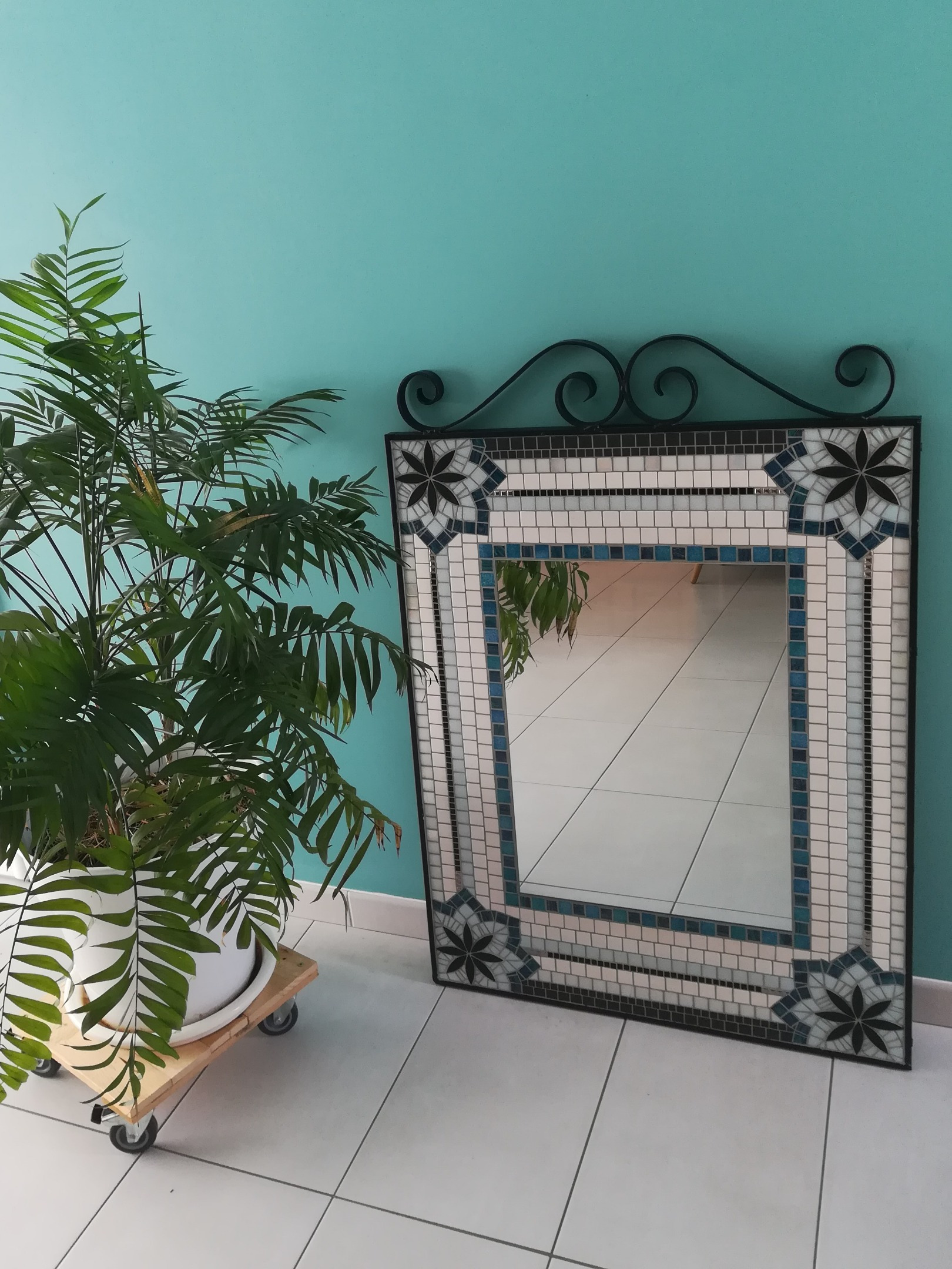 Cette bordure est devenue celle du miroir, un grand miroir rectangulaire bordé d’une mosaïque décorative.