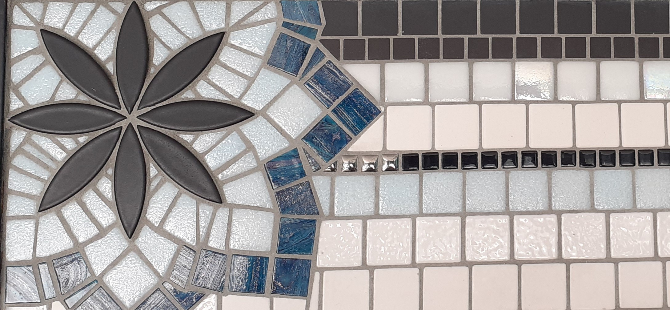 Pour la mosaïque, différents matériaux offrent des nuances brillantes, mates, irisées ou pailletées de bleu, blanc, et noir pour le rappel au cadre et le contraste.
