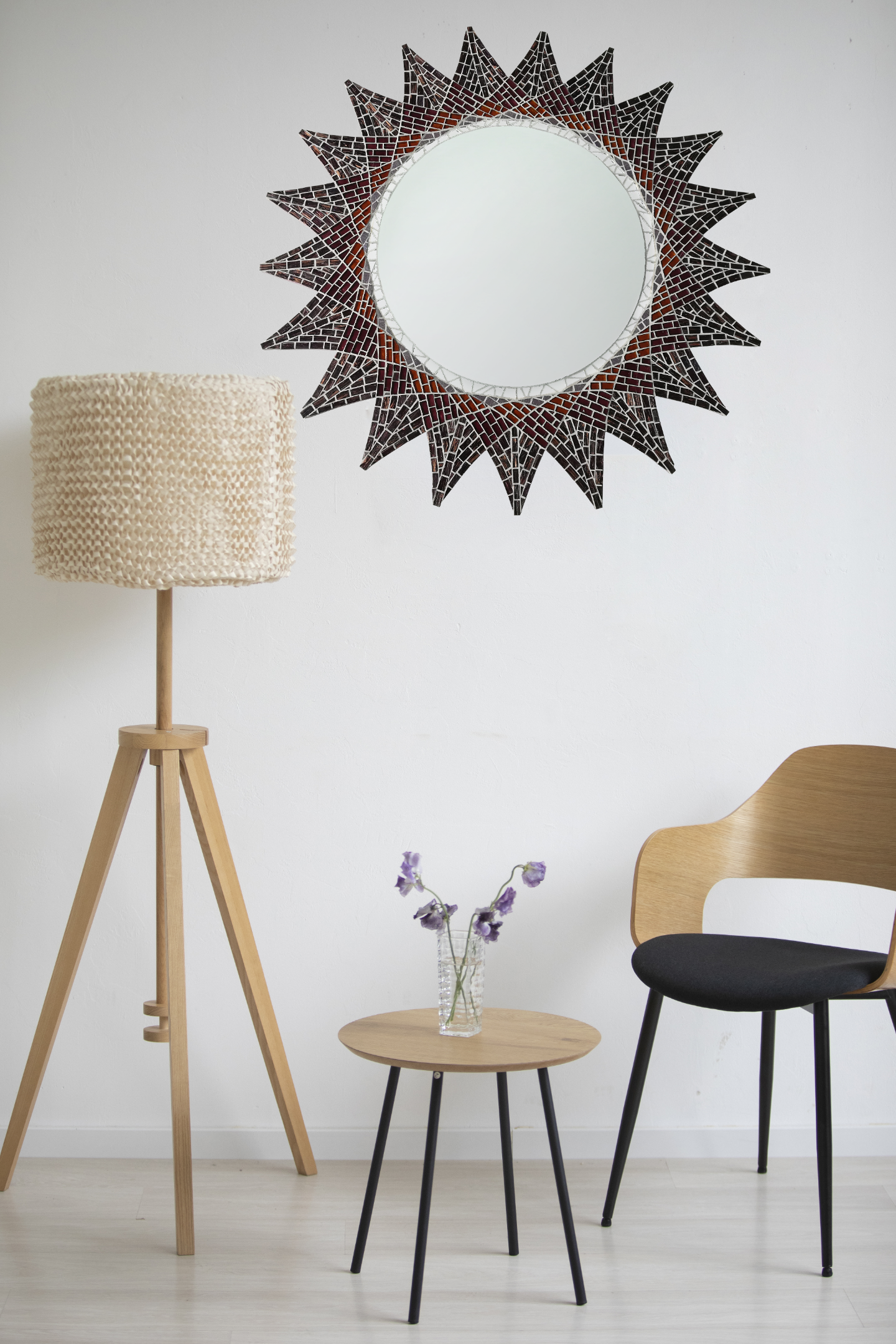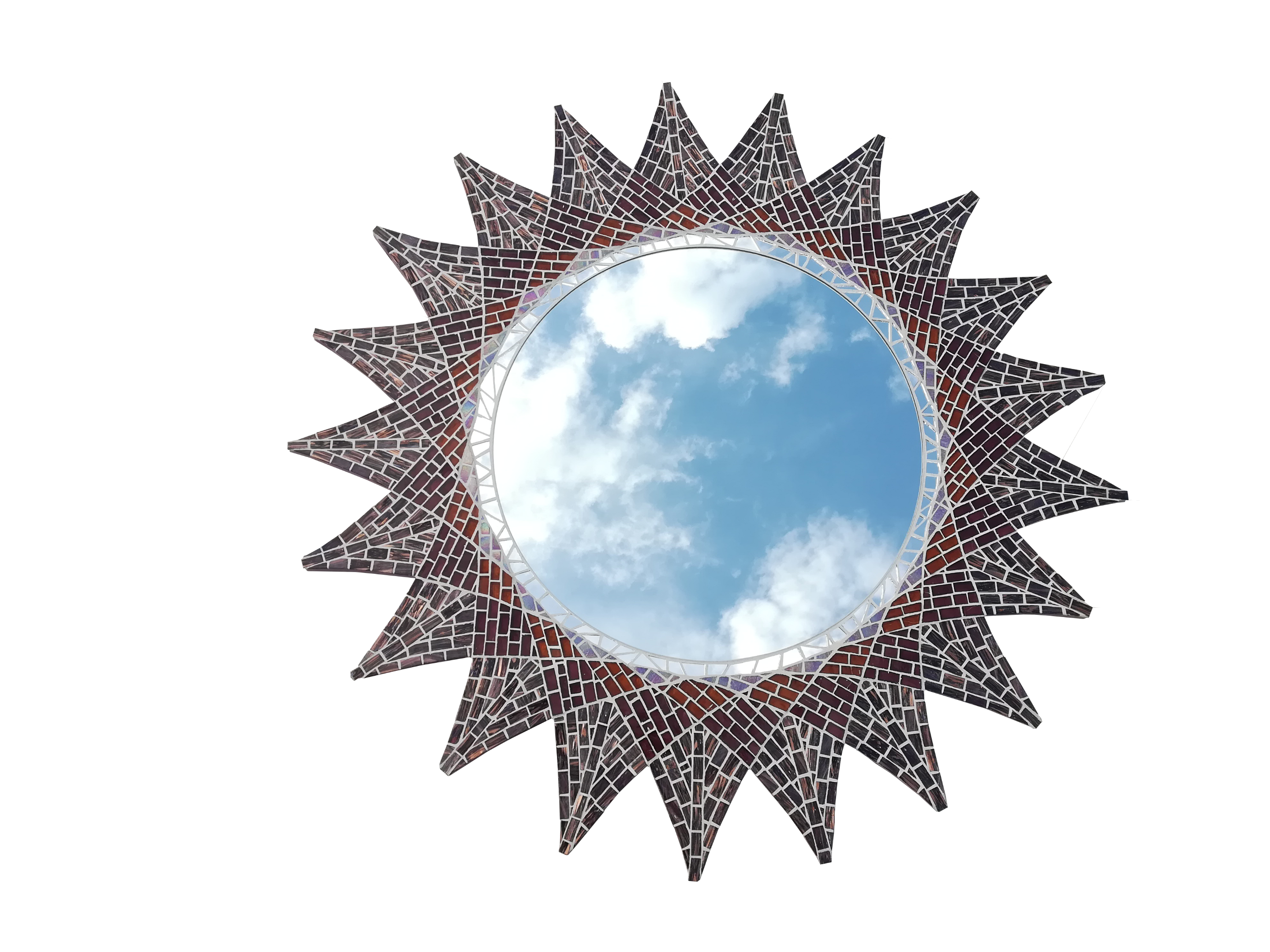 La gamme Spiro est constituée de grands miroirs ronds bordés d’une mosaïque inspirée de la technique du Spirographe.