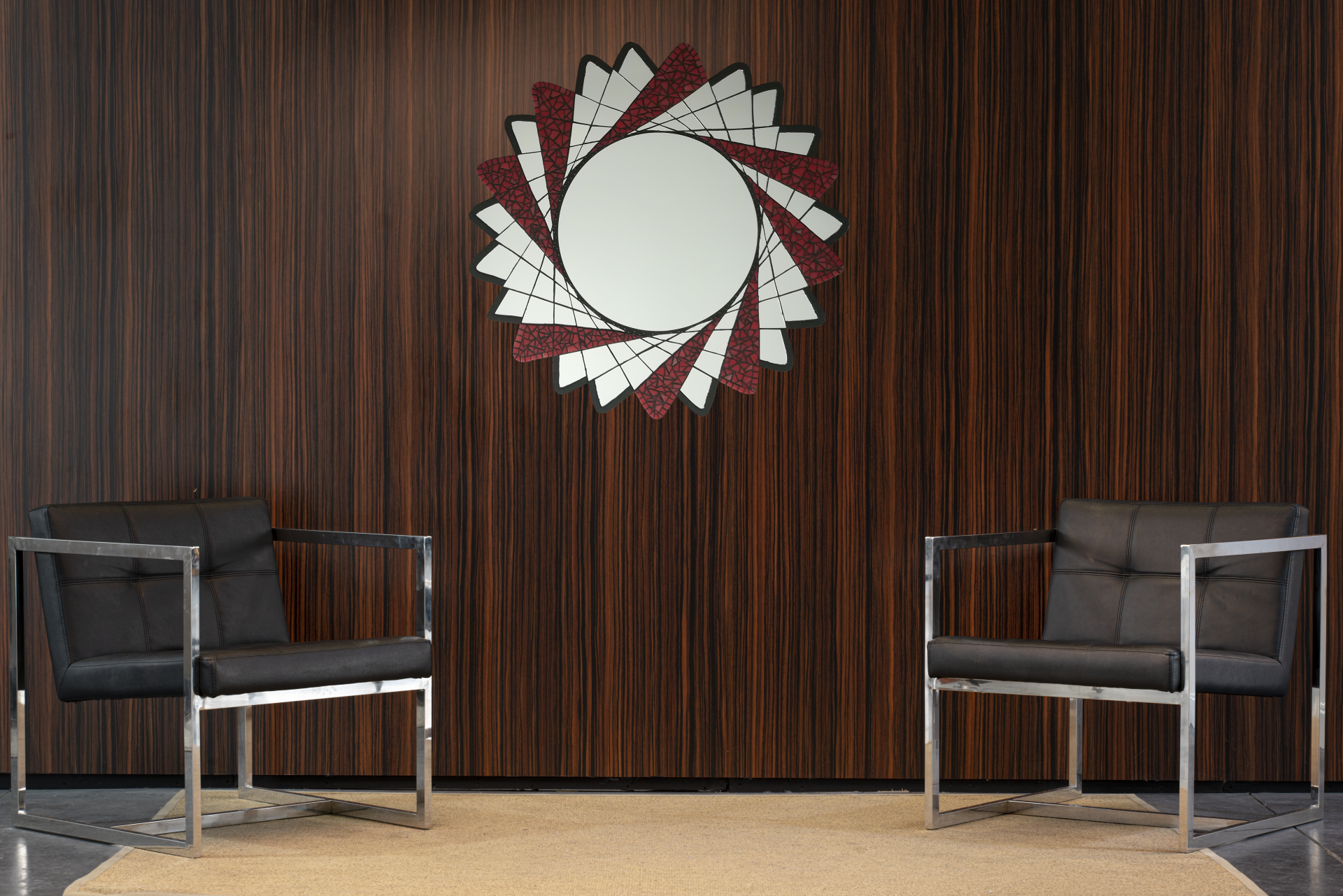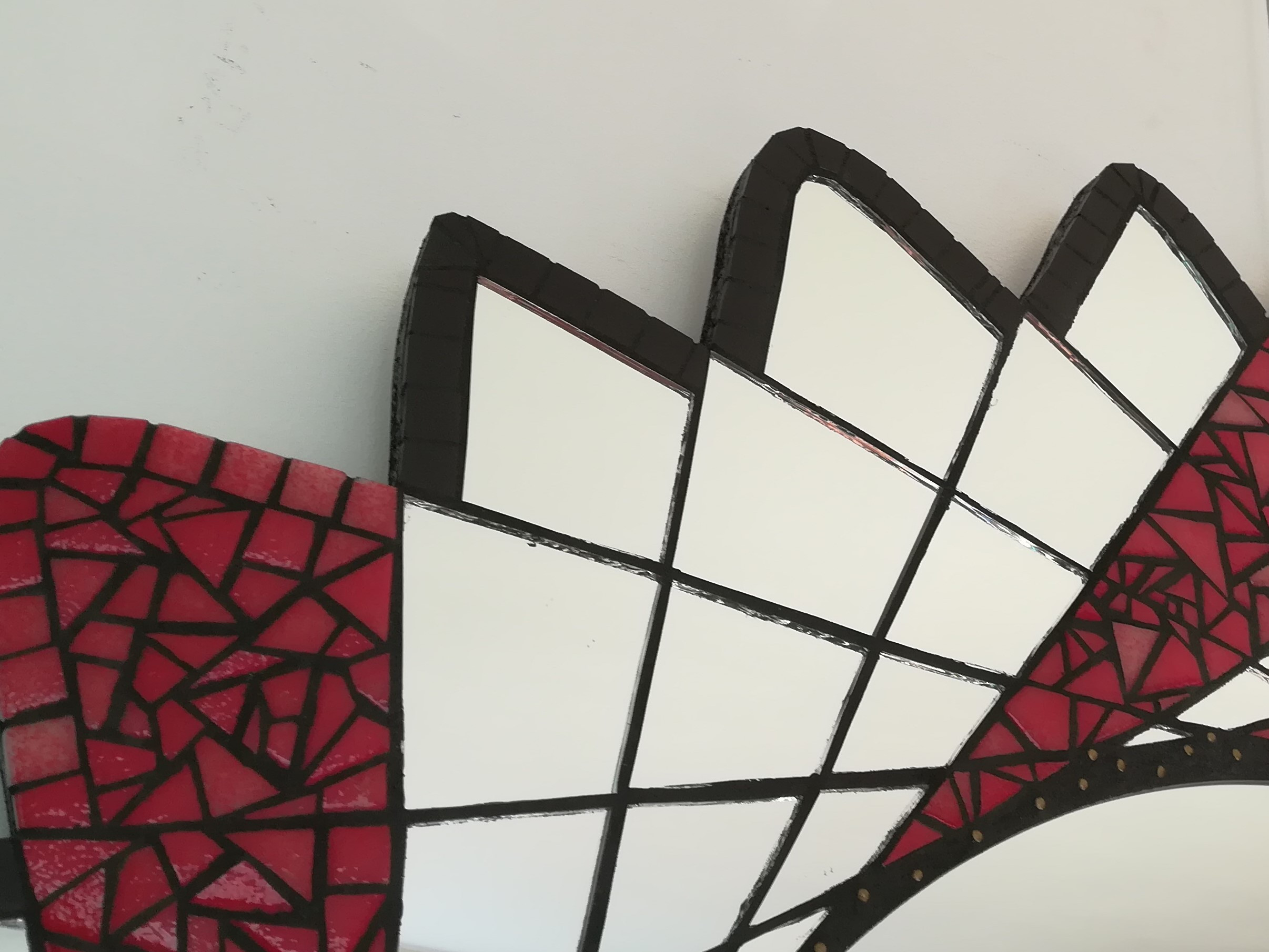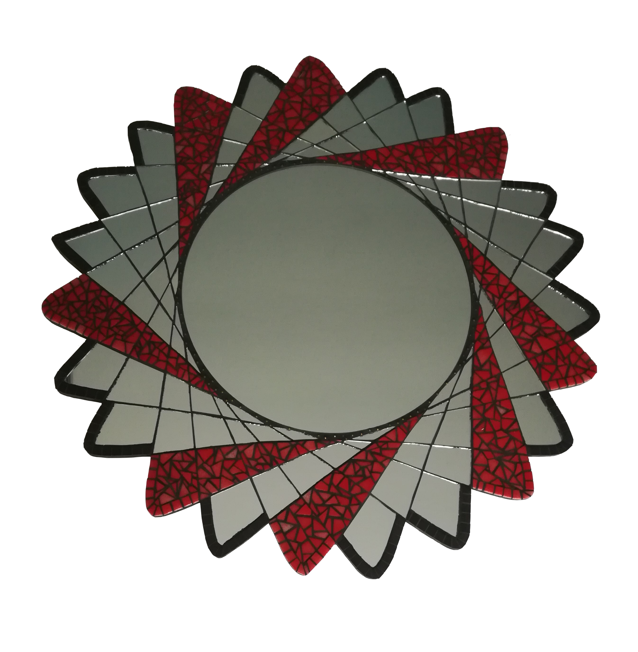 La gamme Spiro est constituée de grands miroirs ronds bordés d’une mosaïque inspirée de la technique du Spirographe.