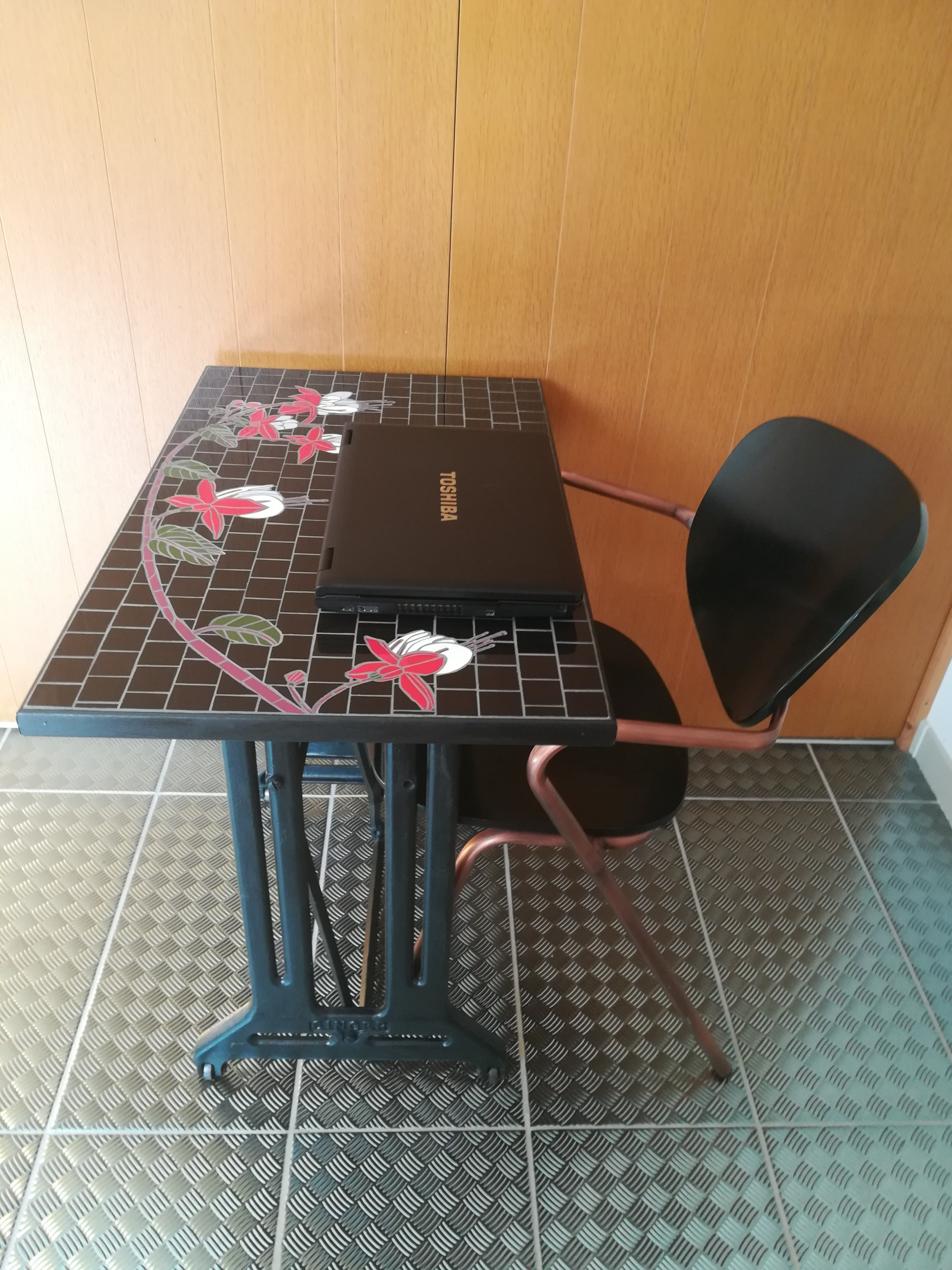 J’ai réalisé par la suite suivant la même technique la table Singer fuchsias.