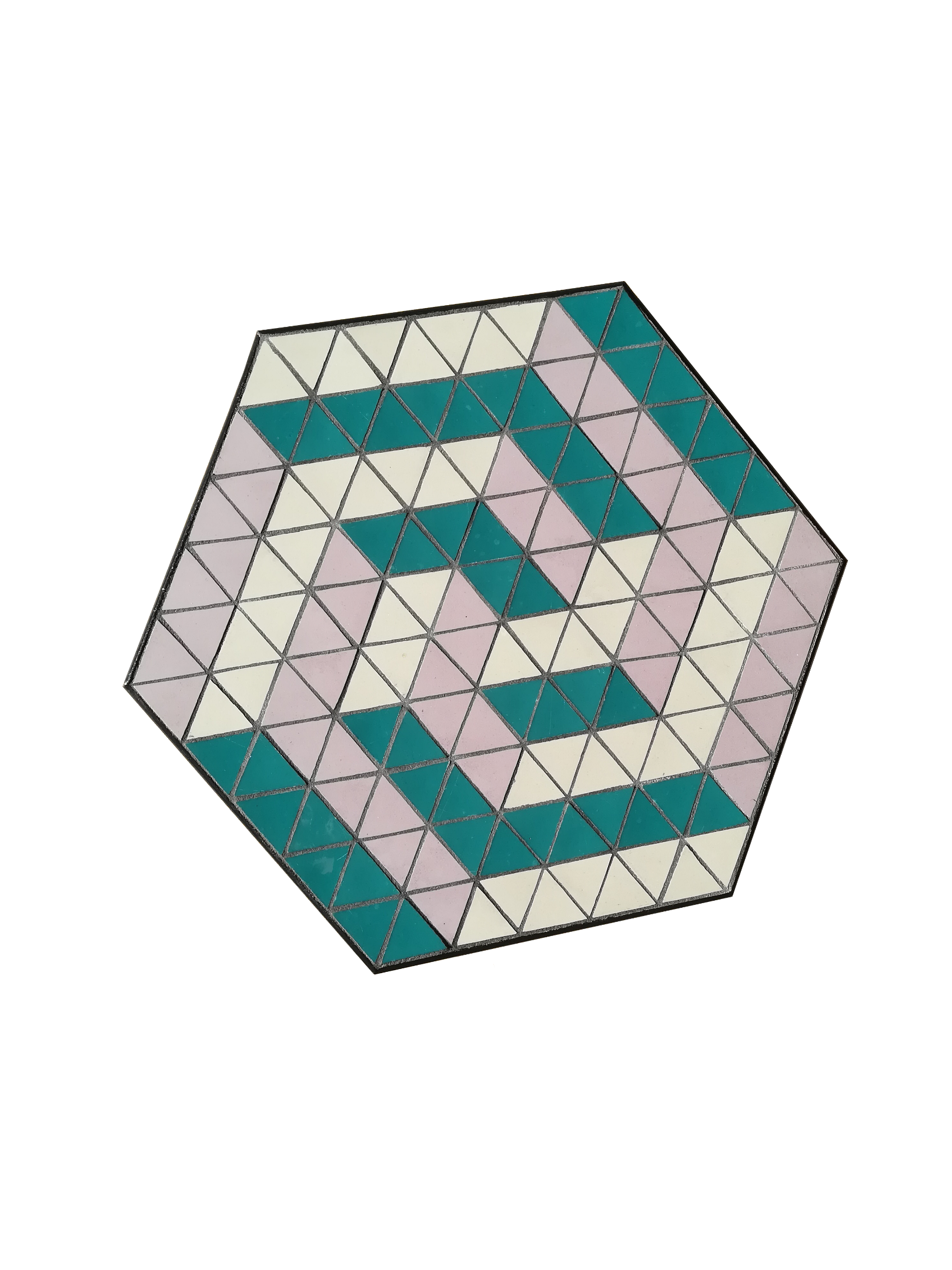 J’ai une attirance particulière pour les formes géométriques qui nécessitent minutie et précision. J’aime particulièrement inventer des motifs qui proposent différents niveaux de lecture et suscitent la curiosité : effets 3 D, illusion d’optique.