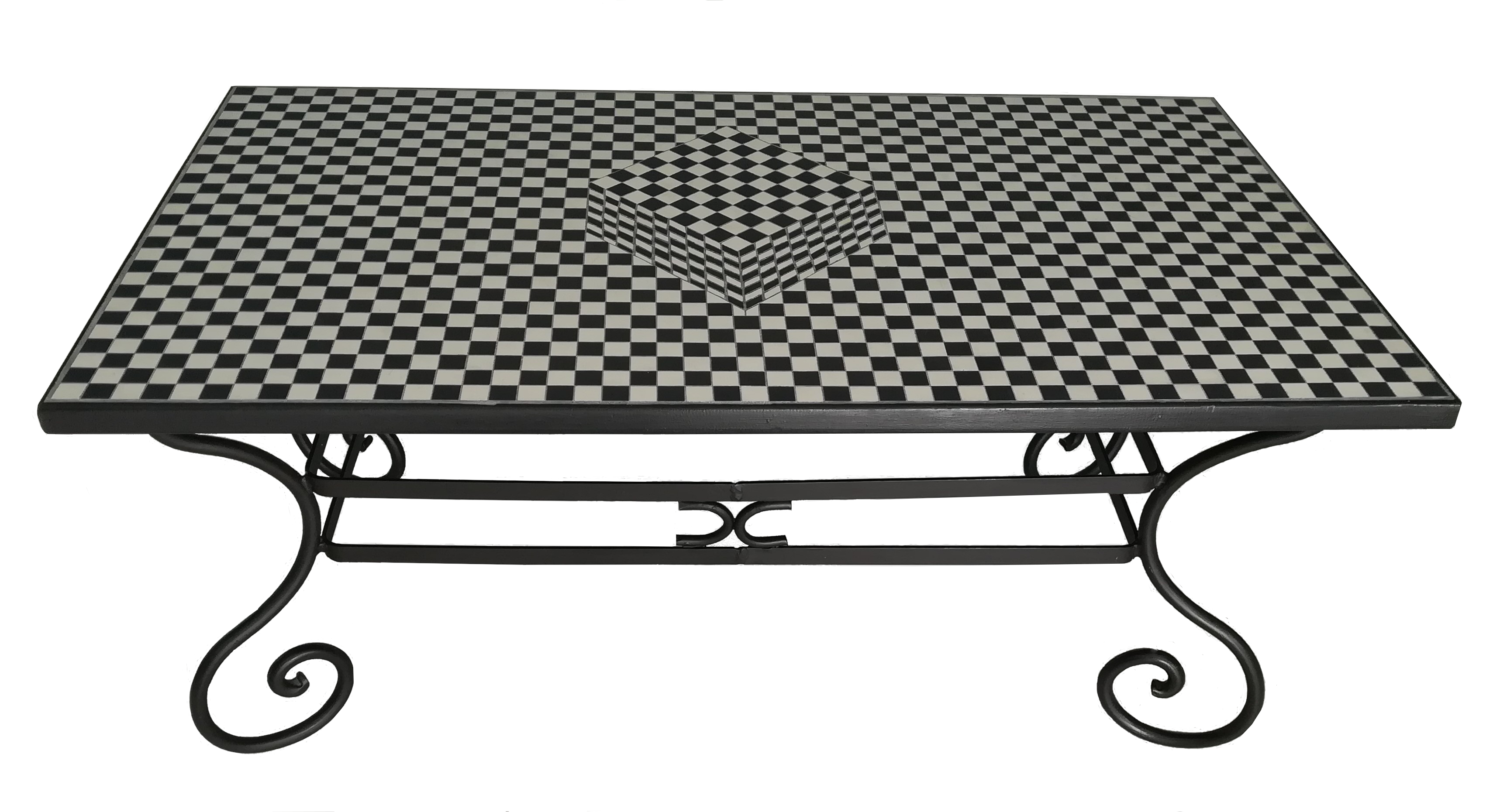 Le dessus de cette table en fer forgé, constitué auparavant d’une plaque de verre transparent, a été remplacé par un plateau recouvert d’une mosaïque.