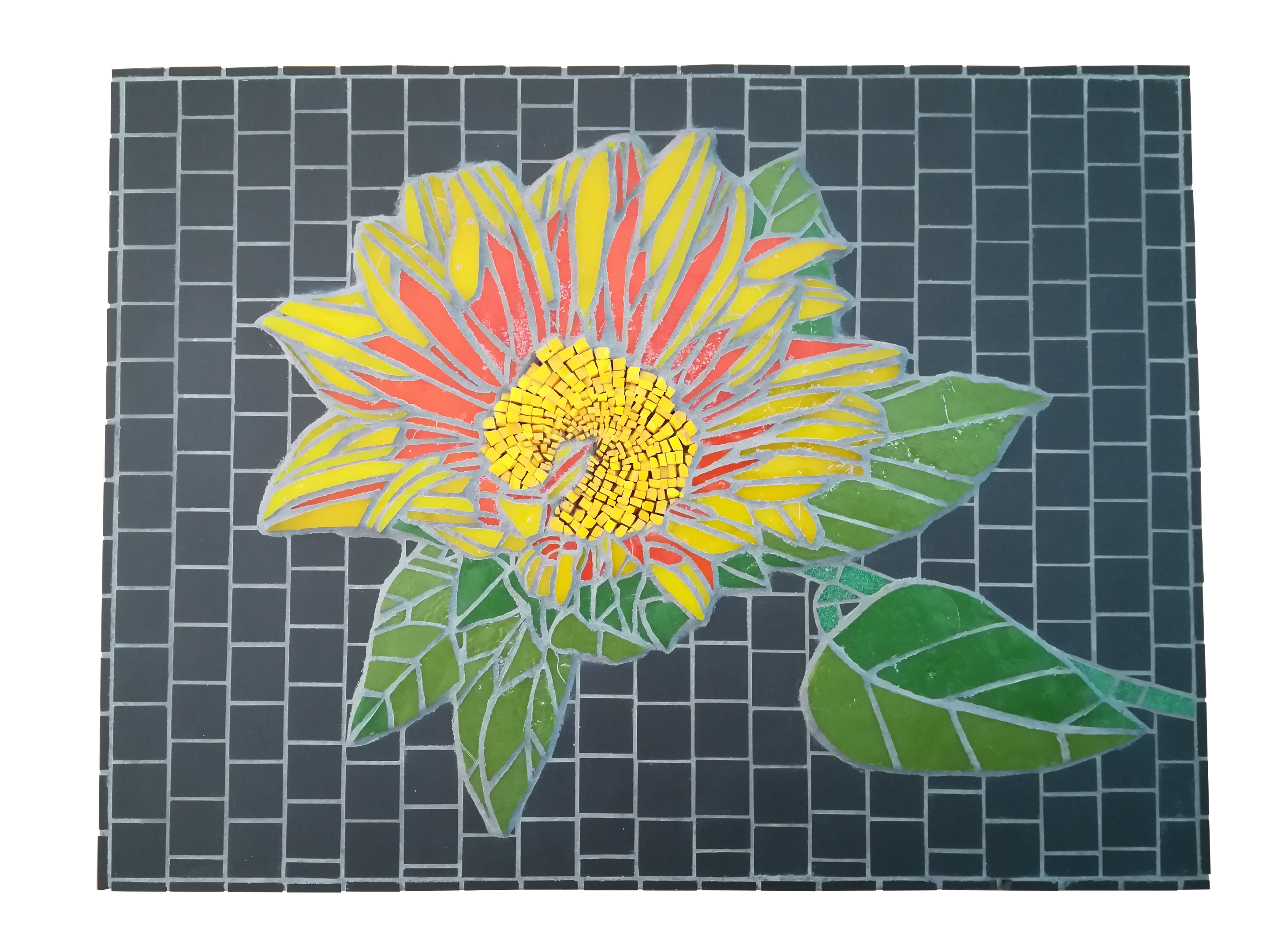 J’ai choisi pour cette mosaïque le verre fabriqué artisanalement dans les ateliers français Albertini ainsi que le smalt. Ces matériaux, par leur épaisseur et l’absence de joint contribuent à créer un relief et à donner l’impression que la fleur sort du tableau.
