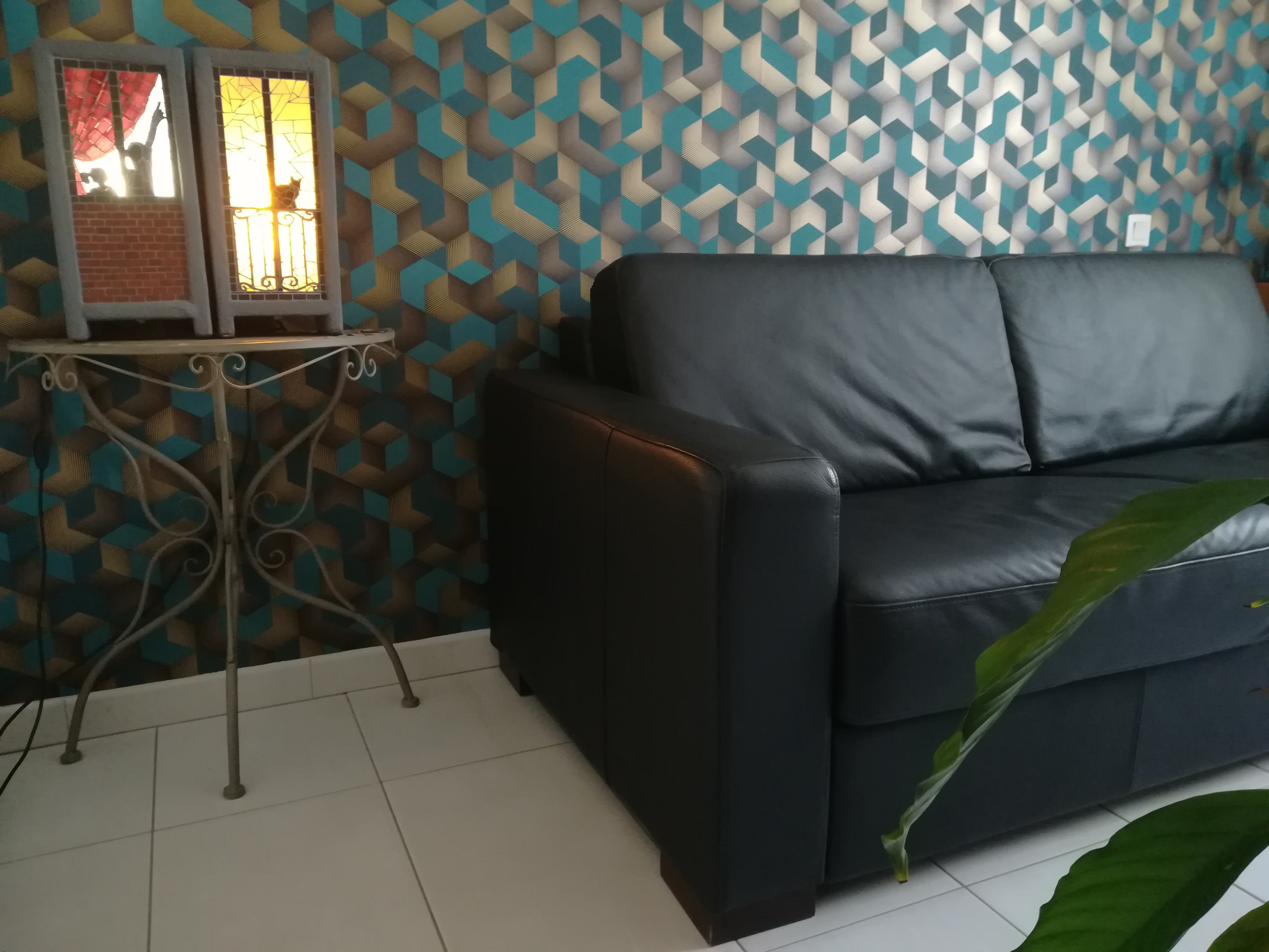 La « fenêtre » de la lampe appart chat dispose d’une balustrade sur laquelle le chat est grimpé et regarde à l’intérieur.