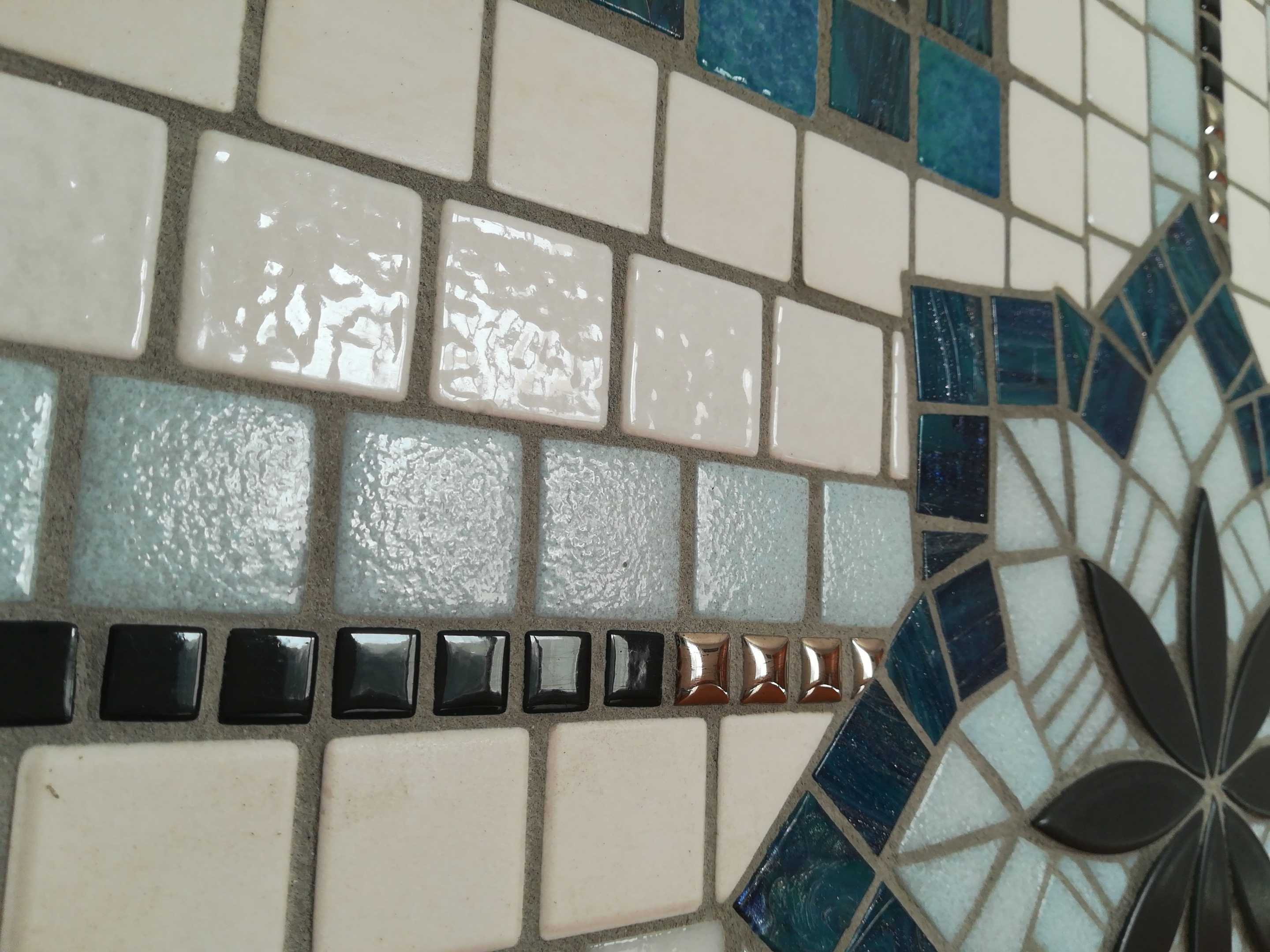 Pour la mosaïque, différents matériaux offrent des nuances brillantes, mates, irisées ou pailletées de bleu, blanc, et noir pour le rappel au cadre et le contraste.